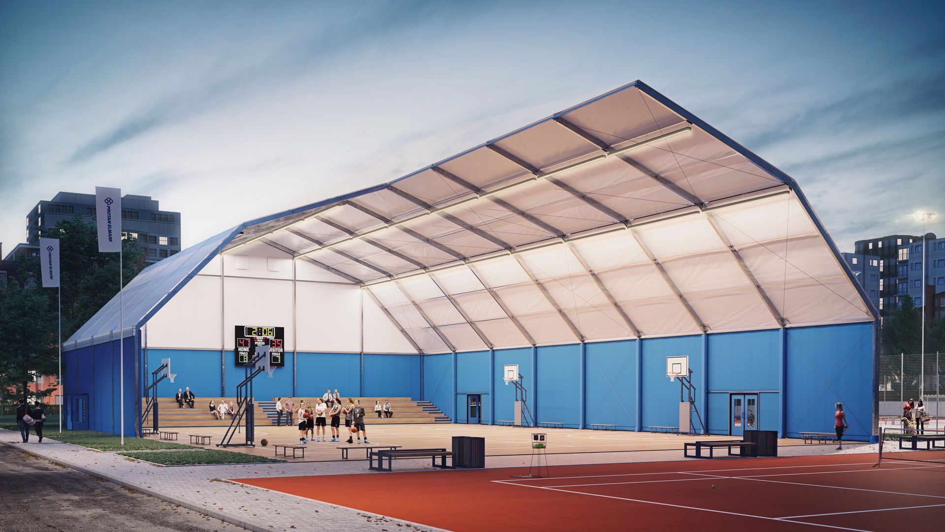 Protan Elmark Forniamo strutture leggere e di alta qualità, su misura per le esigenze del settore sportivo. Queste strutture sono ideali per campi da tennis, piste di pattinaggio sul ghiaccio, palazzetti dello sport, palestre o maneggi e soddisfano tutti i requisiti di sicurezza per lo sport e il tempo libero. Per gli sport che richiedono un campo da gioco rialzato, consigliamo le nostre strutture con tetto a padiglione. Goditi la tua passione in assoluto comfort e sicurezza con
